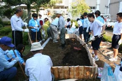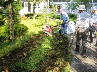 中庭の植える場所を耕耘機で耕していただき、地域の方と生徒のボランティアで