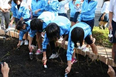 生徒会から呼びかけて、プロジェクトに参加してくれるボランティアと、地域のみなさんにも協力いただき、準備を進めて行きました。地域の方に教えていただきながら植える場所を耕し、フジバカマの苗を植える作業を行いました。