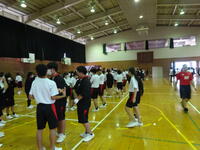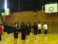 赤組の体育館での練習風景です。色リーダーが中心になり、小グループで演技を教えています。